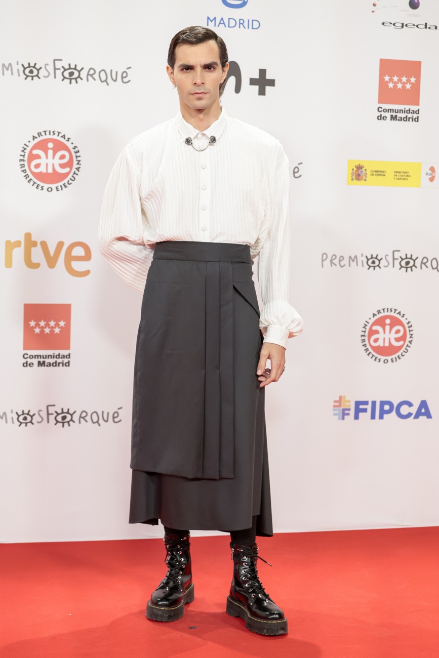 El actor, que está en boca de todos por su papel en la serie ‘Bosé’ ha conquistado a su público luciendo un estilismo rompedor: falda en color negro, camisa blanca plisada con puños abullonados y botas militares.