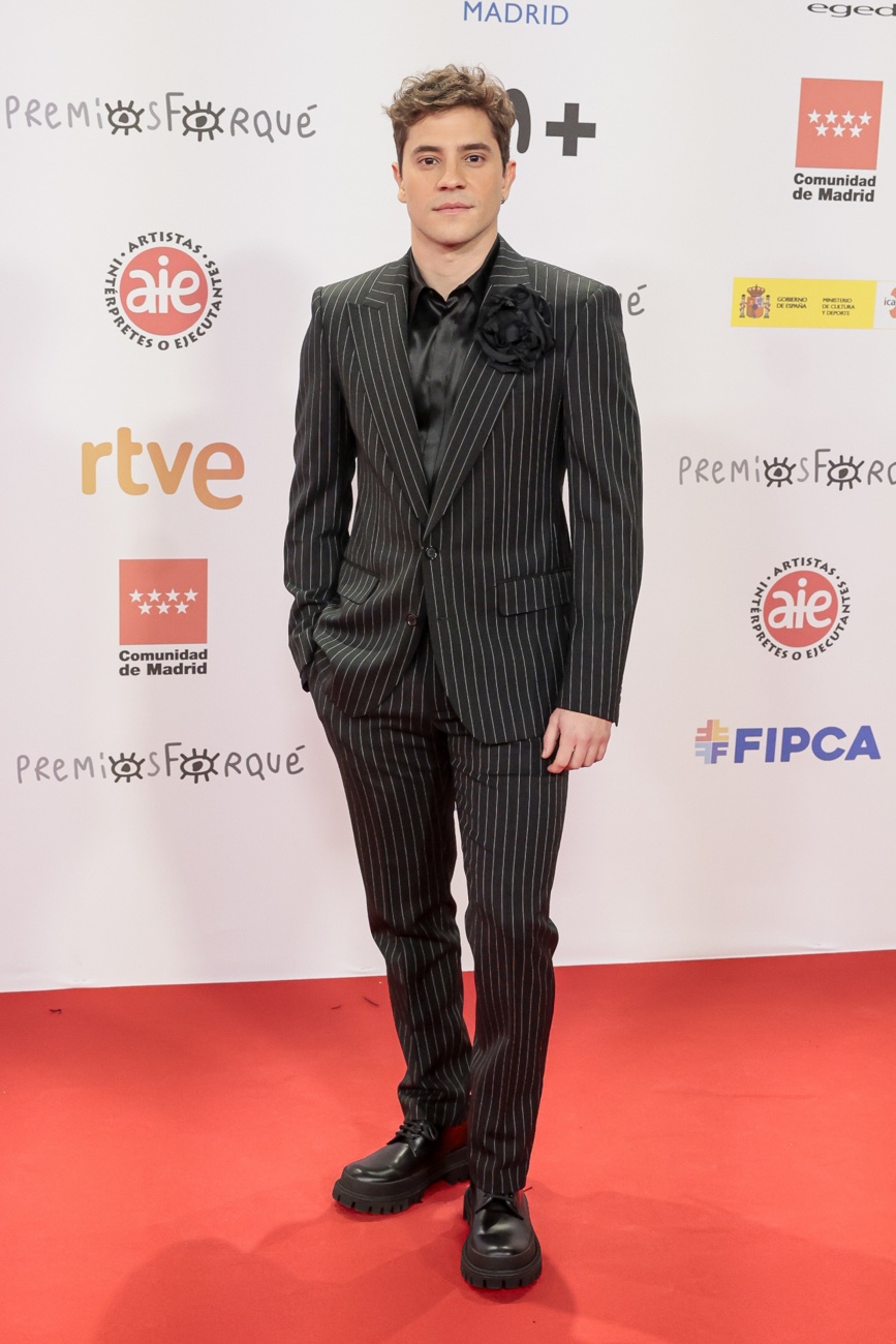Uno de los hombres más deseados tras su paso por ‘Élite’ y también de lo más elegantes esta noche con este traje oscuro con rayas blancas y botines con maxisuela.