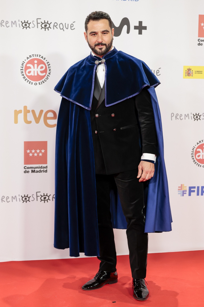 Al más puro estilo »Tierra de lobos» o »La promesa», el actor ha sorprendido en la alfombra roja con un traje de terciopelo en negro que ha combinado con una aclamada capa, también en terciopelo, de color azul.